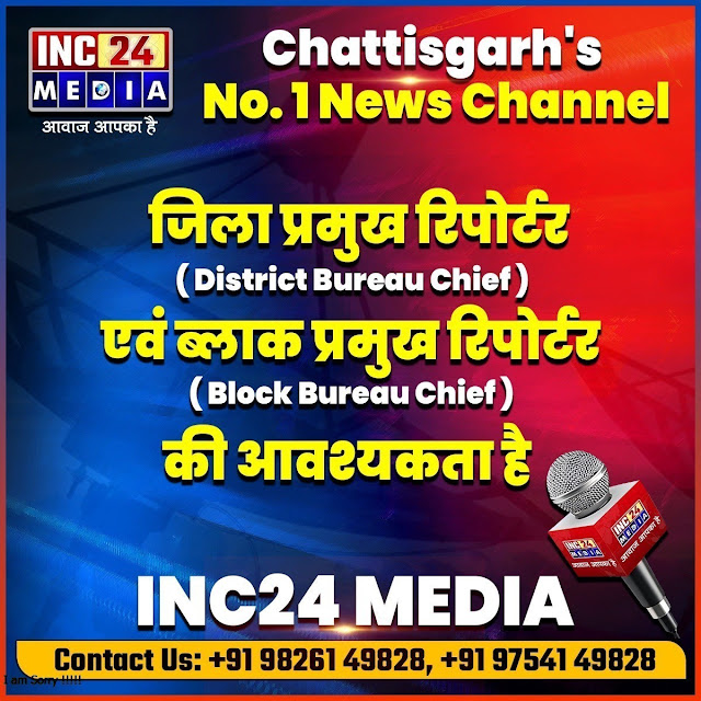 आईएनसी 24 मीडिया न्यूज़ चैनल के लिए सम्पूर्ण छत्तीसगढ़ एवं मध्यप्रदेश राज्यों में रिपोर्टर एवं न्यूज़ एंकर की आवश्यकता है। संपर्क करें- + 91 98261-49828, +91 97541-49828