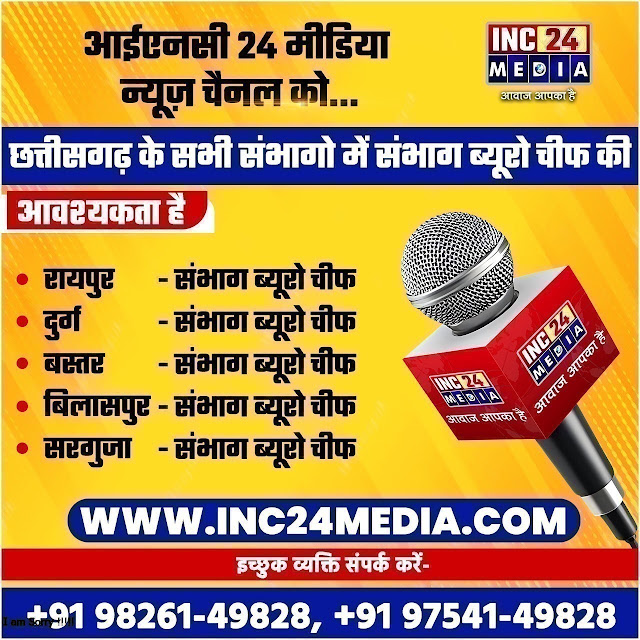 आईएनसी 24 मीडिया न्यूज़ चैनल के लिए सम्पूर्ण छत्तीसगढ़ एवं मध्यप्रदेश और भारत के सभी राज्यों में रिपोर्टर एवं न्यूज़ एंकर की आवश्यकता है। संपर्क करें- + 91 98261-49828, +91 97541-49828