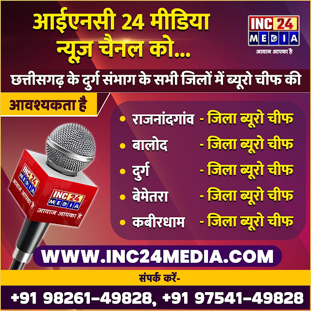 आईएनसी 24 मीडिया न्यूज़ चैनल के लिए सम्पूर्ण छत्तीसगढ़ एवं मध्यप्रदेश और भारत के सभी राज्यों में रिपोर्टर एवं न्यूज़ एंकर की आवश्यकता है। संपर्क करें- + 91 98261-49828, +91 97541-49828