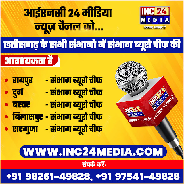 आईएनसी 24 मीडिया न्यूज़ चैनल के लिए सम्पूर्ण छत्तीसगढ़ एवं मध्यप्रदेश और भारत के सभी राज्यों में रिपोर्टर एवं न्यूज़ एंकर की आवश्यकता है। संपर्क करें- +91-98261-49828, +91-97541-49828
