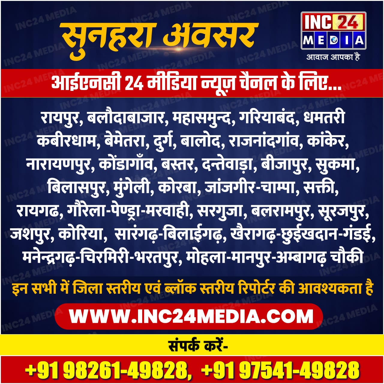 आईएनसी 24 मीडिया न्यूज़ चैनल के लिए सम्पूर्ण छत्तीसगढ़ एवं मध्यप्रदेश और भारत के सभी राज्यों में रिपोर्टर एवं न्यूज़ एंकर की आवश्यकता है। संपर्क करें- +91-98261-49828, +91-97541-49828